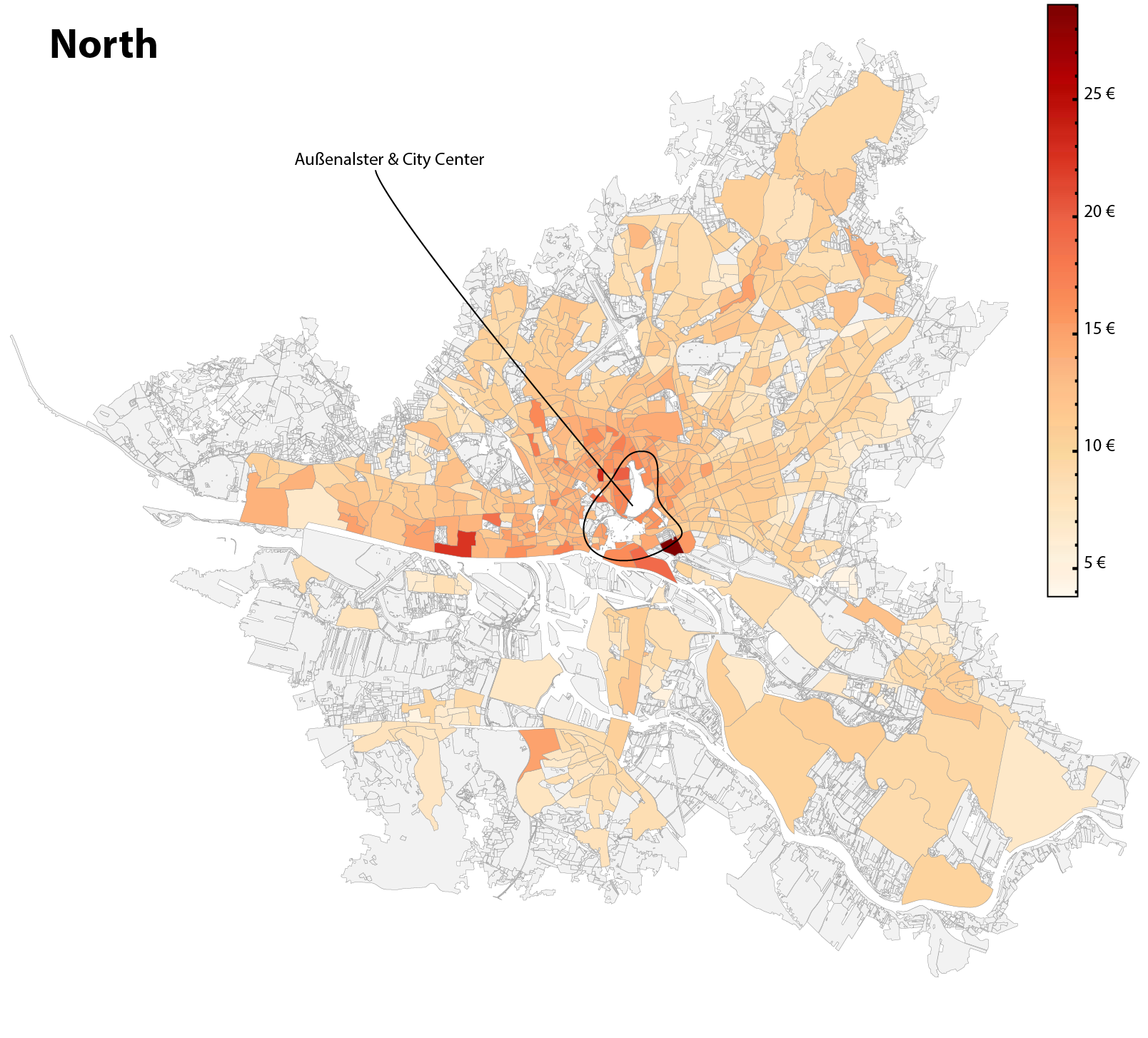 Graphic shows the heat map of the base rent per square meter variable across the federal state of Hamburg, Germany.